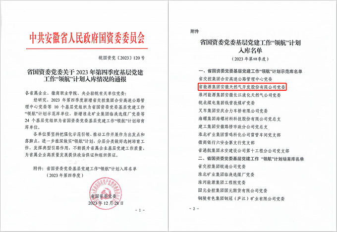 近日,省国资委党委发布了2023年第四季度基层党建工作“领航”计划入库情况的通报,省天然气公司党委成功入选“领航”计划示范库。