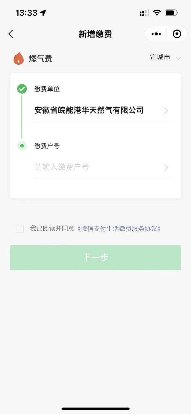 点击微信生活缴费-选择安徽省皖能港华天然气有限公司-输入户号和金额