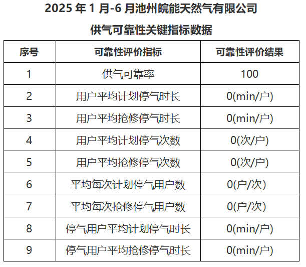 2025年1月-6月供气可靠性关键指标数据