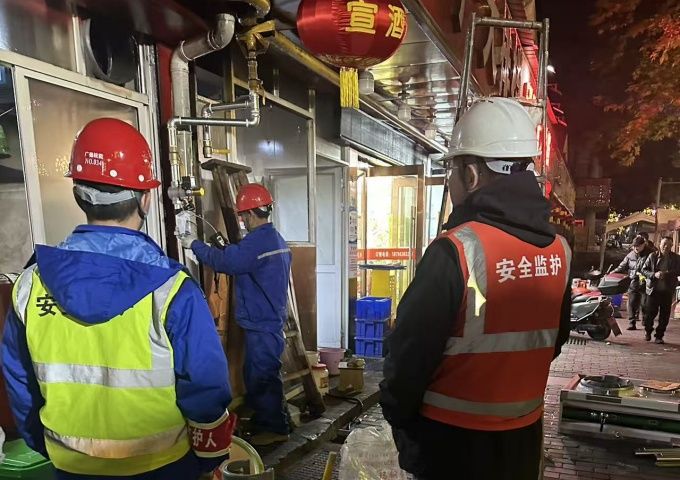 广德公司第一时间响应市委、市政府号召,迅速成立“炖锅一条街燃气配套专项工作组”,由技术骨干牵头制定施工方案,聚焦“破解日间客流密集施工难题”“保障商户用气需求”两大核心目标,推出“白备夜干”工作机制。白天施工人员开展现场勘查、管线规划、材料转运等前期准备工作;当夜幕降临后,迎春街等核心区域客流渐息,施工团队立即进场,在应急照明设备的映照下开展管道铺设,分班组轮班作业,确保进度一天一推进。