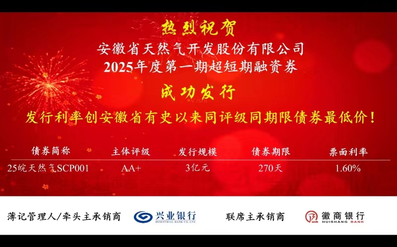 本期超短期融资券由兴业银行和徽商银行担任主承销商,依托省天然气公司良好的信用资质和稳健的经营表现,吸引了众多金融机构的积极参与,最终发行利率较全国同期市场平均水平低11个基点,充分彰显了外部投资者对省天然气公司发展前景的高度认可。