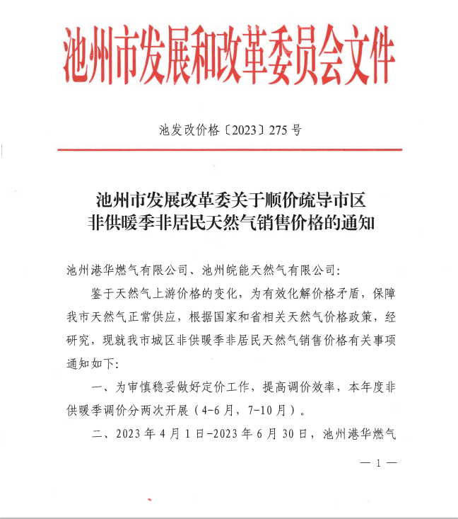 池州市发展改革委关于顺价疏导市区非供暖季非居民天然气销售价格的通知