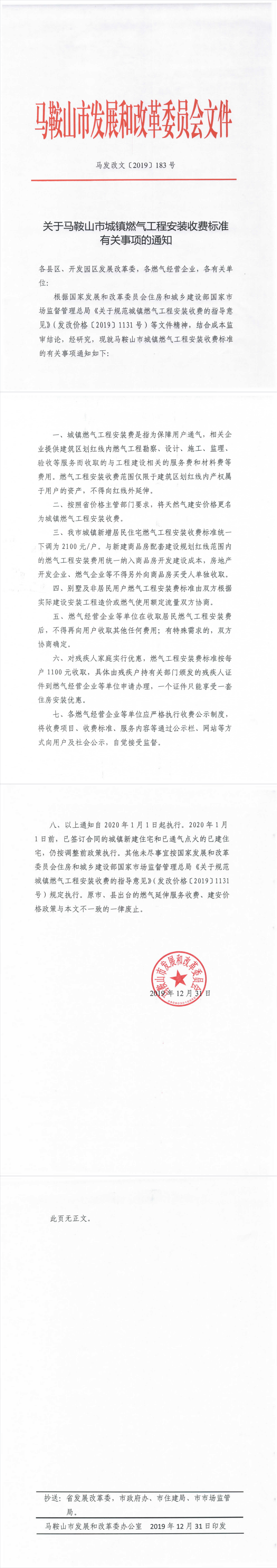 关于马鞍山市城镇燃气工程安装收费标准有关事项的通知(马发改文【2019】183号)