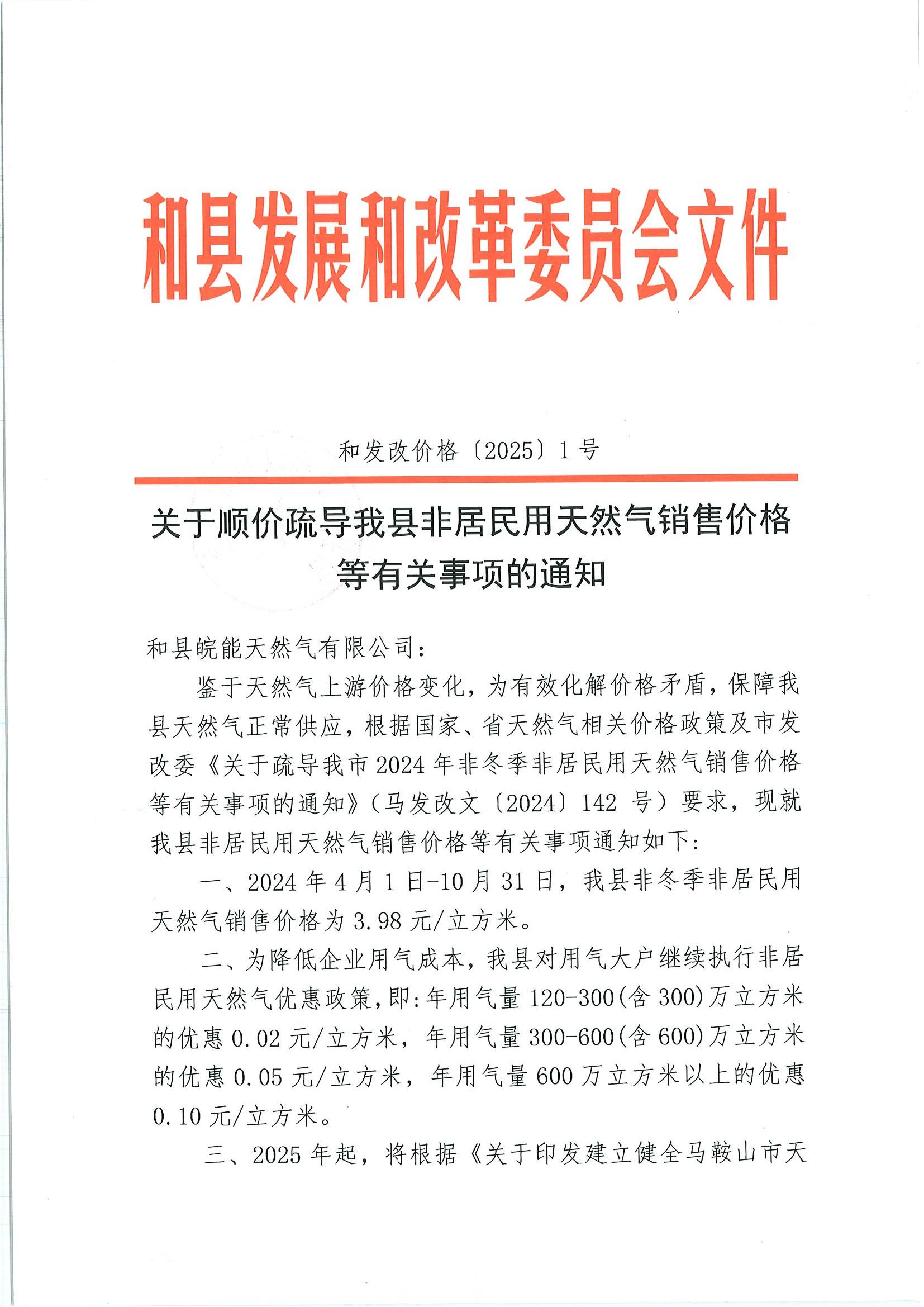 关于顺价疏导我县非居民用天然气销售价格等有关事项的通知 (和发改价格〔2025〕1号)