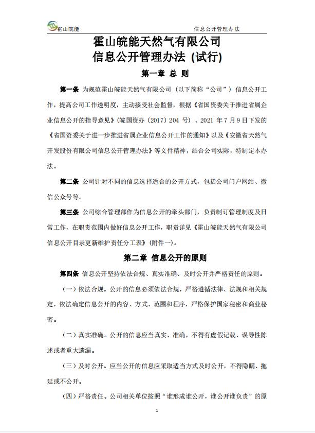 关于印发《霍山皖能天然气有限公司信息公开管理办法(试行)》的通知