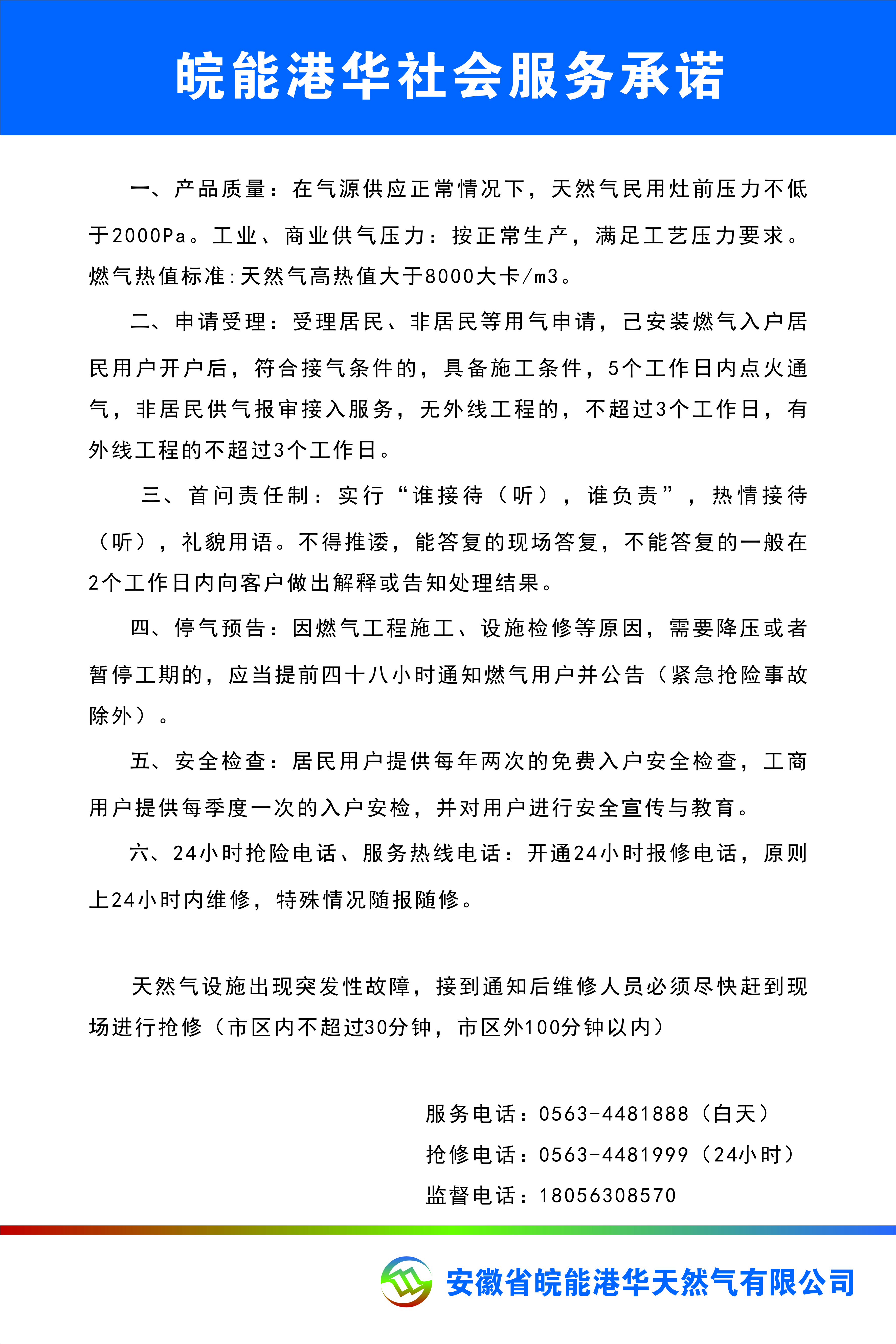 安徽省皖能港华天然气有限公司服务承诺
